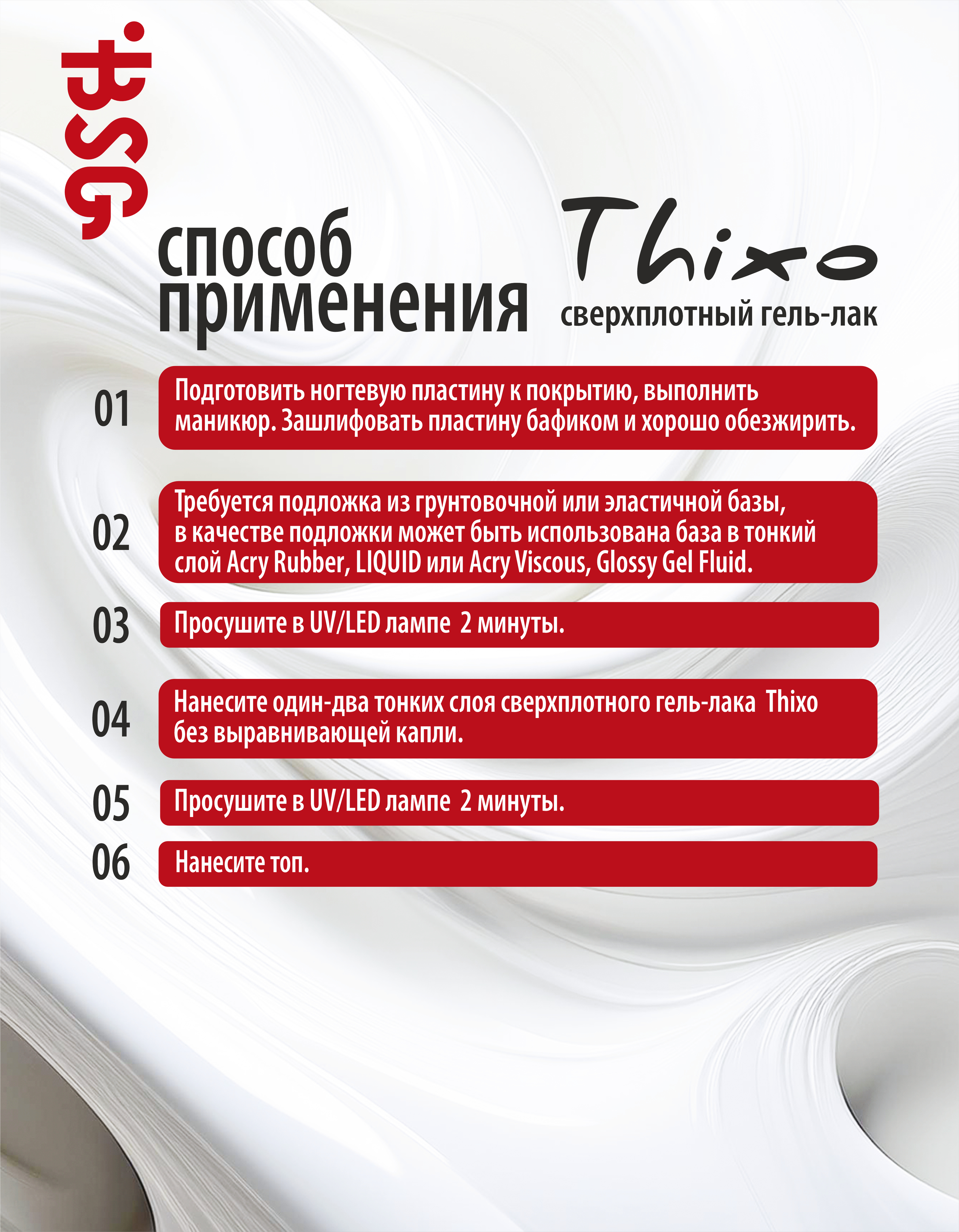 Рекомендуем наносить гель - лак "Тиксо" в 1 слой (исключение составляют несколько сложных по своей природе оттенков, таких как жёлтые). Рекомендуемое время полимеризации слоя - 2 минуты.