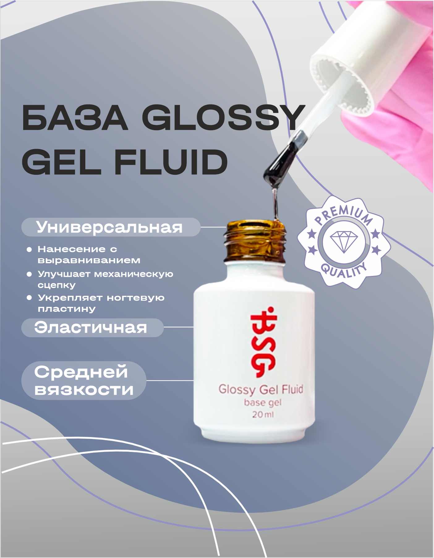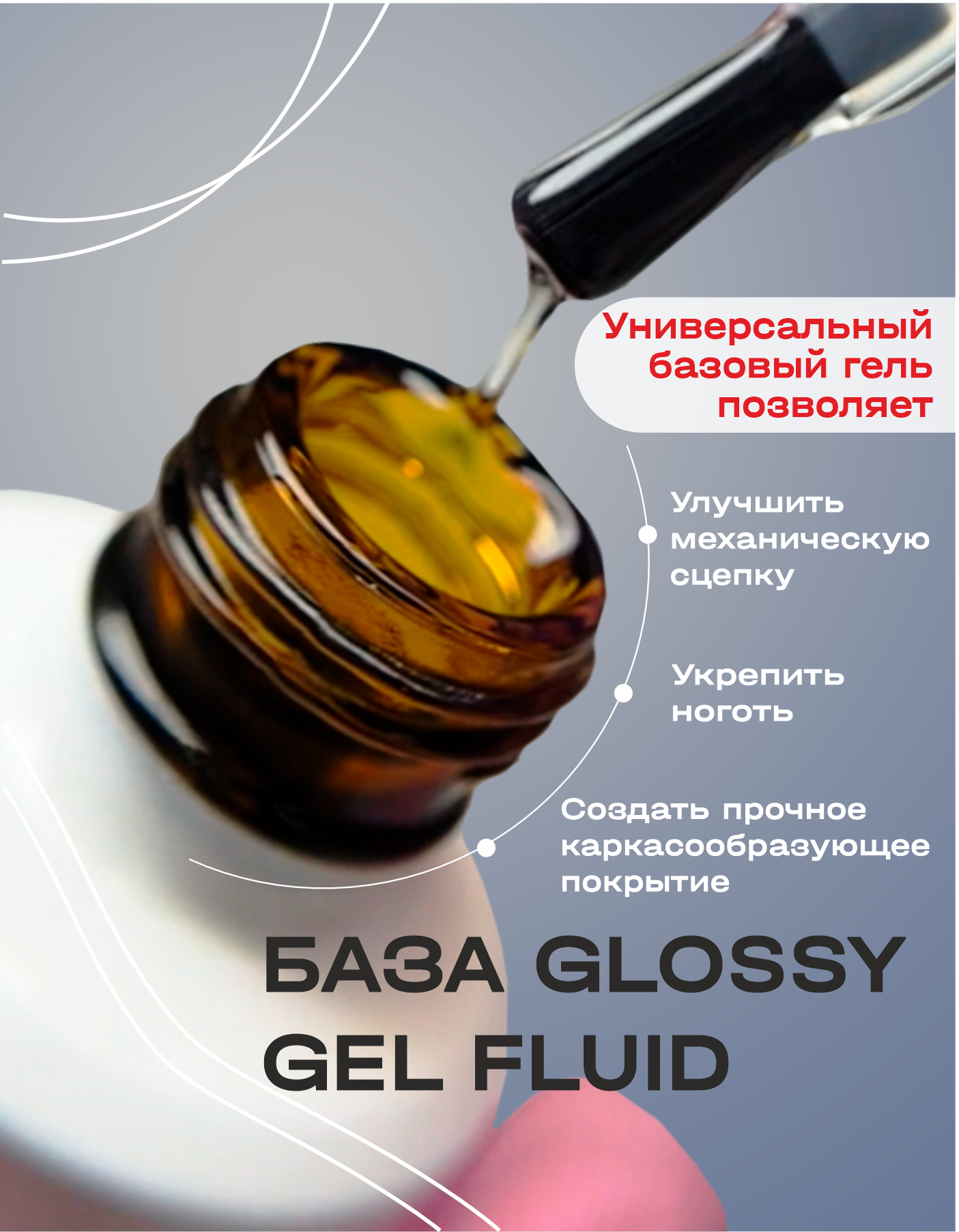 Glossy gel fluid (8мл и 15 мл  с кистью) – универсальный базовый гель. Разработан специально для укрепления изношенной ногтевой пластины. Обладает усиленной сцепкой с ногтем. Создает прочное каркасообразующее покрытие для ногтей. Используется для выравнивания ногтевой пластины, создания прочной и правильной архитектуры ногтя. Снимается как сухим способом, так и с помощью размачивания ацетон содержащими средствами.