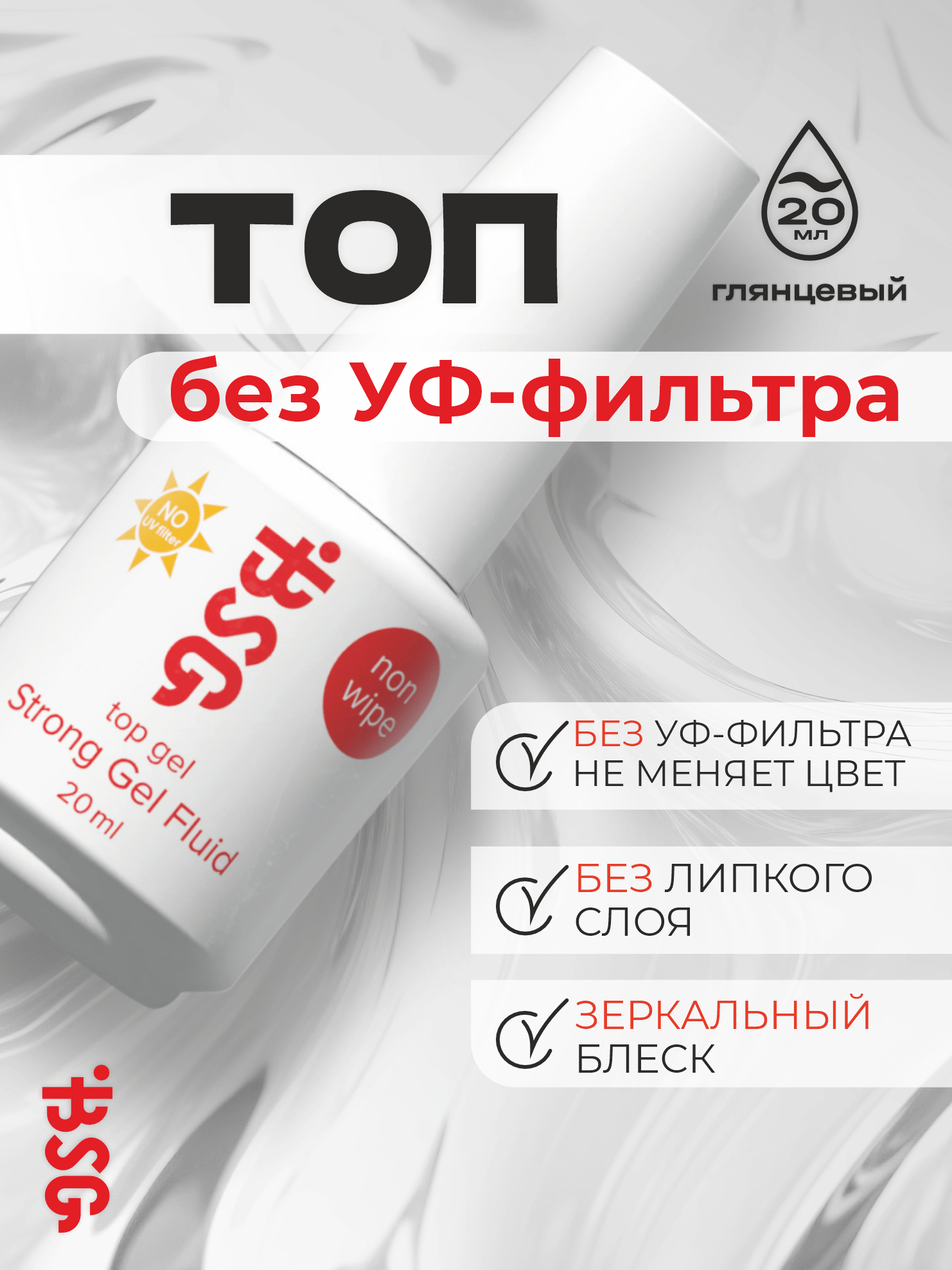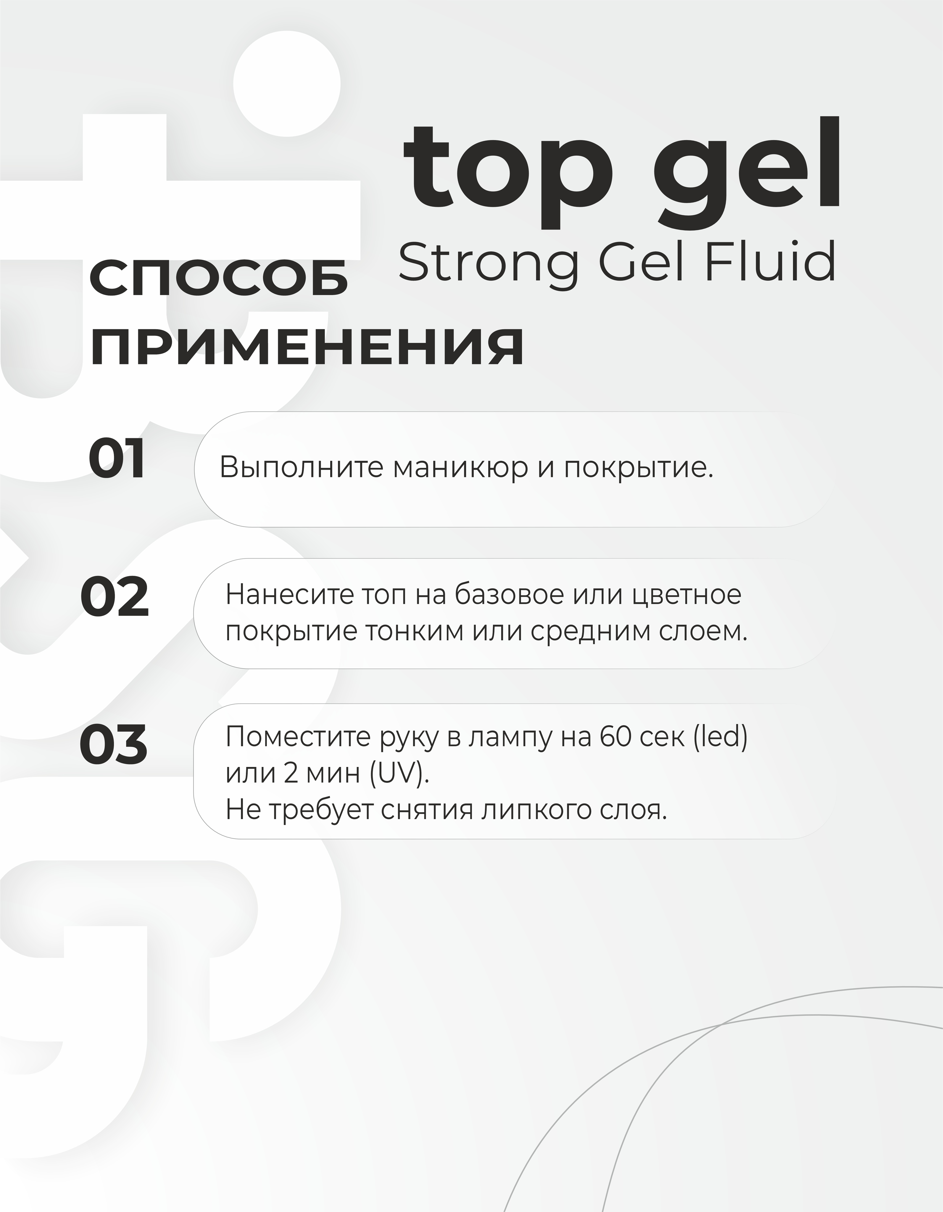 Strong fluid non wipe NO UV - уникальный эластичный топ без липкого слоя. Обладает зеркальным блеском.
